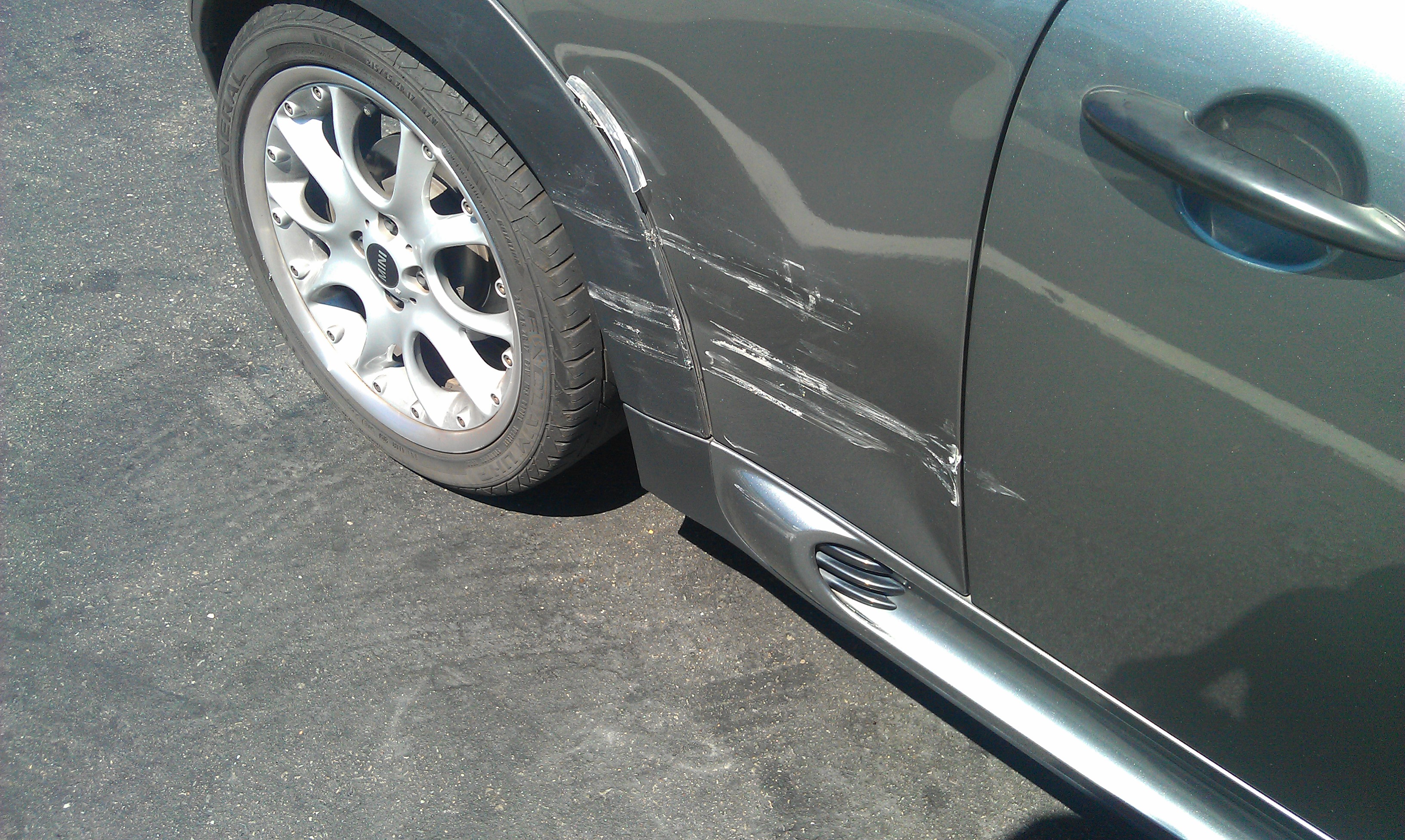My wife sitting in the outboard right turn lane makes the right turn on a green light to have the car on the inboard side decide to go straight. Initial estimate to my car is $2600 in damages including the rim which she scratched.