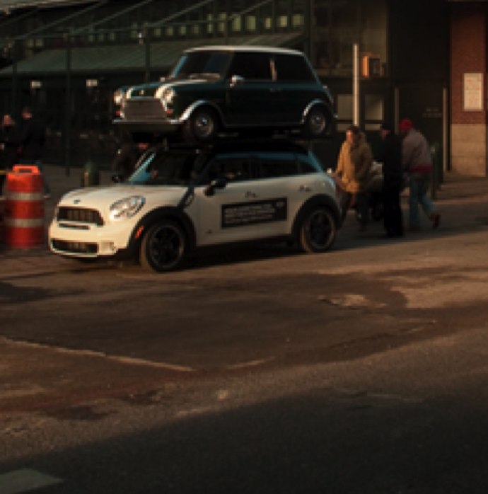 A friend snapped this phone pic in NYC. Mini Countryman driving around town with a Classic Mini on top.