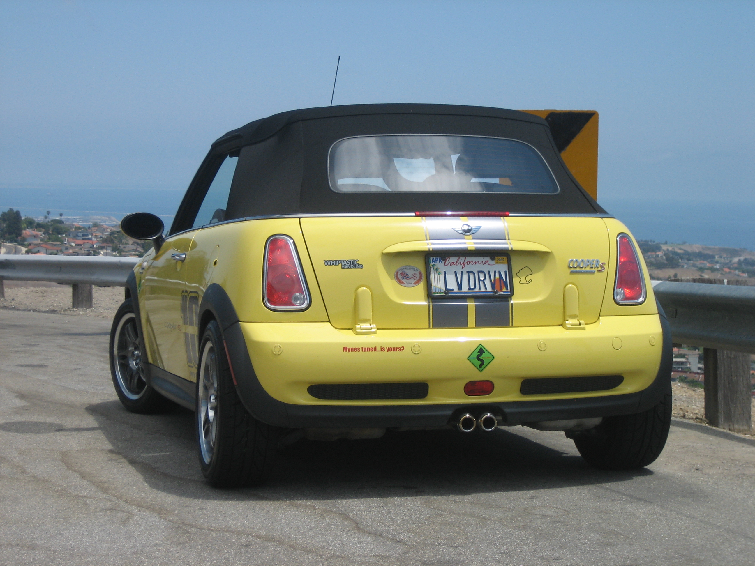 2005 MCSc - Sport Pkg, LSD, Chrono, Webb 15% underdrive SC pulley, Hubie V1 cam, Myne's ECU dyno tune, Bosch 550cc injectors, NGK Iridium plugs range 7, Koni FSD's, H-Sport adjustable camber plates (~-1.6 degrees camber all-round), Dunlop Direzza Z1 star specs 205/50/16 on Koenig "Holes", CG Locks, Van's Deadpedal, Top Commander, GBMINI's Auto-Up w/ DSC override