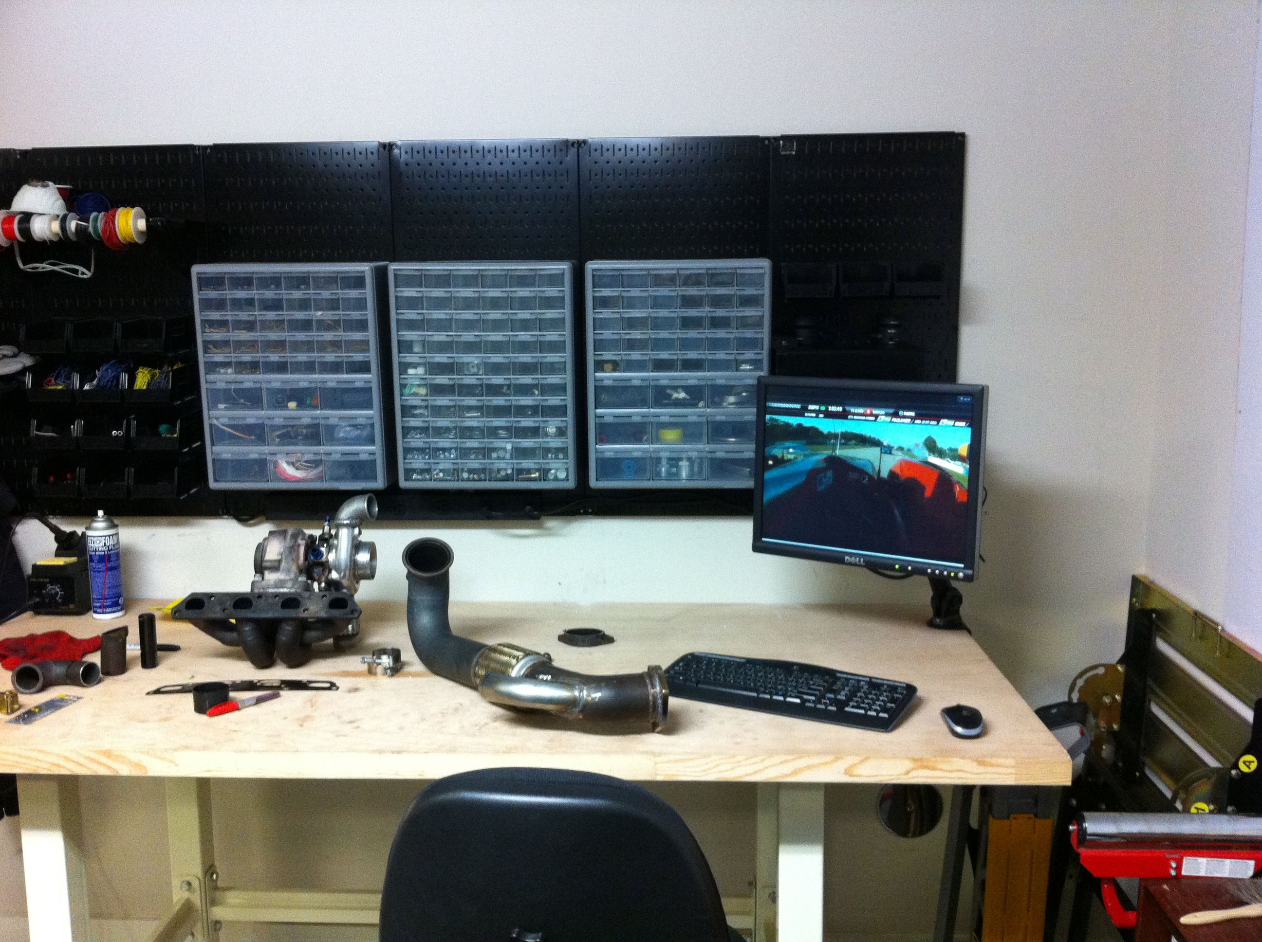 Picture of computer mounted above workbench watching ALMS race streaming on ESPN3